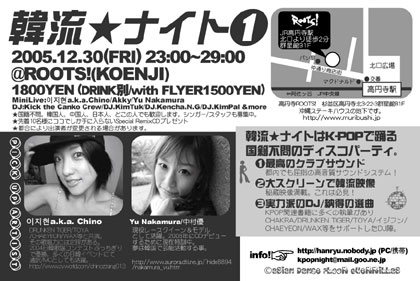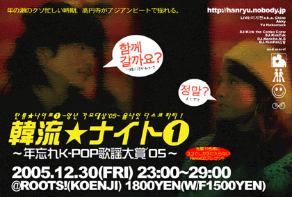 ◇韓流☆ナイト? 年忘れ K-POP歌謡大賞'05◇ ◇日時◇:2005年12月30日 23時〜29時 ◇場所◇:高円寺 CLUB ROOTS! 〜 群星館B1F 〜(高円寺駅北口徒歩2分) http://www.muribushi.jp/rootshp/info_r.html 料金:1800円(withFLYER1500円) +1ORDER ◇DJ◇:KickTheCankoCrew/DJ.きむ・たく/ DJ.Kencha.N.G/DJ.KimPal ◇Live◇:LeeJihyon a.k.a Chino/中村優 ◇special LIVE◇:「レイジーボーンHG」a.k.a ジントシオ(ex LAZYBONE) 先着10名にオリジナルスペシャルミックスCDプレゼント http://hanryu.