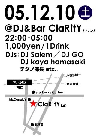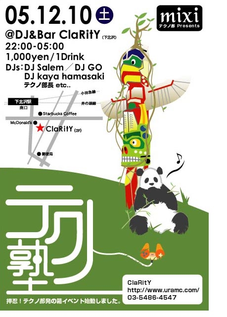 やっとキタ━━━━━━━(°∀°)━━━━━━━ッ!! 「テクノde花見」から9ヶ月・・・・・ 長らくお待たせいたしました。 「テクノ部」初の箱イベント『テクノ塾』開催です。 メインDJは、DjSalem (まこと せーらむ) http://mixi.jp/show_friend.pl?id=250676 テクノDJ「DjSalem」と トランストラックメーカー「MAKOTRAX」 二つの顔を持ち、その幅広い音楽性に裏付けされたプレイは オーディエンスを確実に別世界へ連れて行ってくれます☆ ハッキリ言って踊れます!超カコイイヽ(´∀`)ノです。 箱は、DJバー「cla