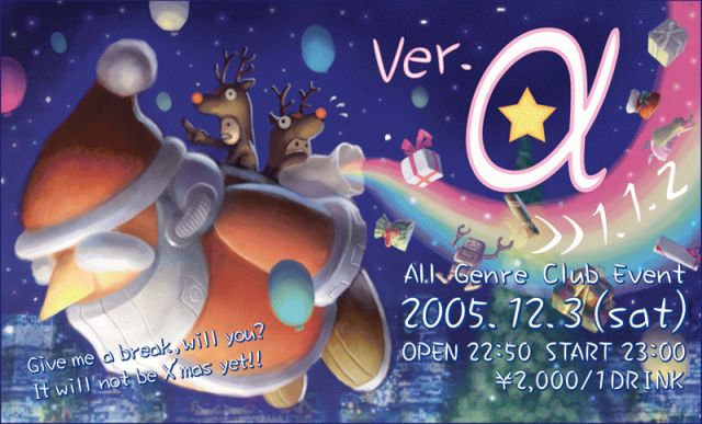 転げ回りながらも駆け抜けてきた2005年シーズン。 [ver.α 1.1.2]は、そんな1年間の総決算SP開催です! クリスマス? 忘年会? まとめて面倒みてやろうじゃないか! 終わりよければ全て良し。 次回も色々とオモシロイことを詰め込みまくってご提供 しちゃいますので、皆様奮ってお越し下さいませー。 ※お知らせ※ 【ver.α】では現在、絵描きさん・WEBデザイナー・当日 お手伝いをしてくれるサポートスタッフさんを募集中です。 興味のある方はスタッフまでご連絡ください。 DJ参戦希望の声も随時受け付け中です★ ----------