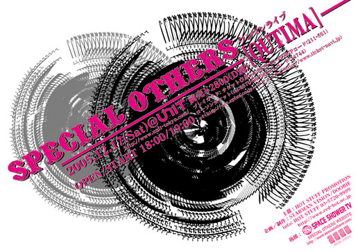 SPECIAL OTHERS ワンマンライブ- [QUTIMA]-tokyo 2005.12.17(sat.)@UNIT(代官山) OPEN/START=18:00/19:00 TICKET=前売¥2,800(ドリンク 別) LIVE=SPECIAL OTHERS ▼プレイガイド チケットぴあ 0570-02-9999(Pコード211-561) ローソンチケット 050-00-0403(Lコード34744) イープラス http://eee.eplus.co.jp チケットナビ http://www.ticket-navi.ne.jp e+ 主催:HOT STUFF PROMOTION 企画/制作:STARMAN VISION/DOOBIE info: HOT STUFF 03-5720-9999 http://www.red-hot.ne.jp ■UNIT 東京都渋谷区恵比寿1-34-17 ザ・