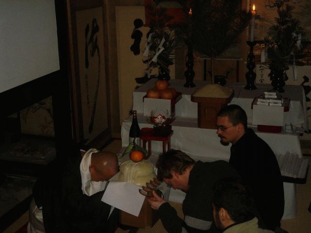 当院三宝院では、後夜祝いという年越し行事を行っており、 大晦日もお泊りいただけます。 あいにく1日からはお泊りいただけないのですが、 もしご興味がございましたらお問い合わせください。 ≪後夜祝い≫ 0時より本堂で初厄除けの護摩祈祷、 あわせて北面大師像(弘法大師・鎌倉時代)の拝観を していただき、続いて、土室(つちむろ/いろりの間)で 後夜祝いを行います。 後夜祝いでは「松三宝の儀」が執り行われます。 【昆布挟み】 参拝者に松三宝にのせた昆布挟み (米と勝栗を挟んだもの)を授与。 【戴き