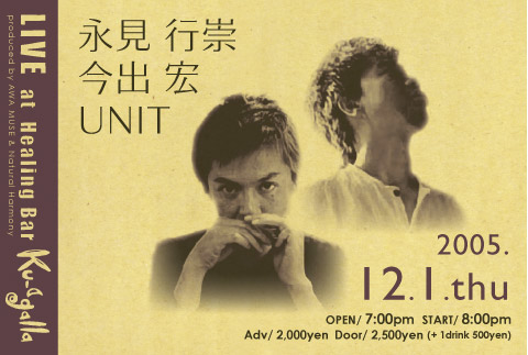 今週木曜日、12/1に 横浜/青葉区江田にある クーカラという、洞窟のような空間で http://www.ing-plants.com/shop/ku-cgalla/liveinfo/0512/1201/index.html 今出 宏゚&永見崇高 unitのコンサートがあります。 詳細は下記をご確認下さい。 今出宏゜& 永見 行崇 UNIT LIVE@Healing Bar Ku-cgalla 日時:2005年12月1日(木) 開場:7pm 開演:8pm 会場:ヒーリングバー クーカラ(レストラン コア2F) チャージ:予約2,000円 当日2,500円(+1drink 500yen) 出演:今出宏゜ [http://homepage2.nifty.com/imadin