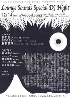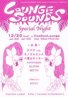南国ムードただようエキゾチックなライブ・バーVooDooLoungeで、 毎週火曜に開催してますイベント「LOUNGE SOUNDS」は、 楽しくて刺激的な音楽とお酒を楽しむためのパーティーです、 みなさんフラリと遊びに来てね!!! <12月のLOUNGE SOUNDSスケジュール> 会場)VooDooLounge open 19:00 start 19:30 料金 \1000+1drink order (※12/20のみopen 18:30 start 19:00 料金 \1500+1drink order) 12/6 (火) Live)QQQ/escalade/Jyu'z/dj for hire/roi scahider 司会&DJ)ボギー 12/13 (火