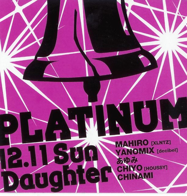 本日、PLATINUM。 踊れん音はいらん! ブリブリ バッキバキに踊らせます。 お時間ありましたら、是非遊びに来てください。 お待ち致しております。 12・11(SUN) PLATINUM @club Daughter TECHNO HOUSE DRUM'N'BASS BREAKBEATS 20:00〜MID DOOR :¥1000 DJ MAHIRO(XLNTZ/FORTUNE) YANOMIX あゆみ CHIYO(HOUSSY) CHINAMI MC AGO(XLNTZ/FORTUNE) VJ TAMAKI(dragthin