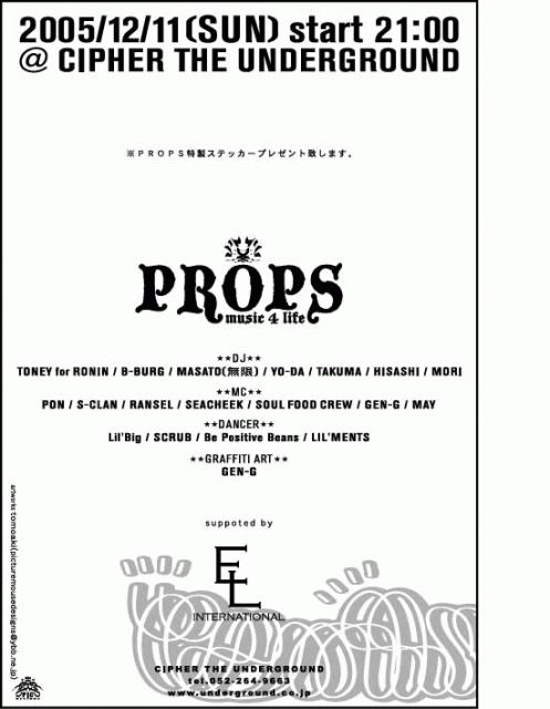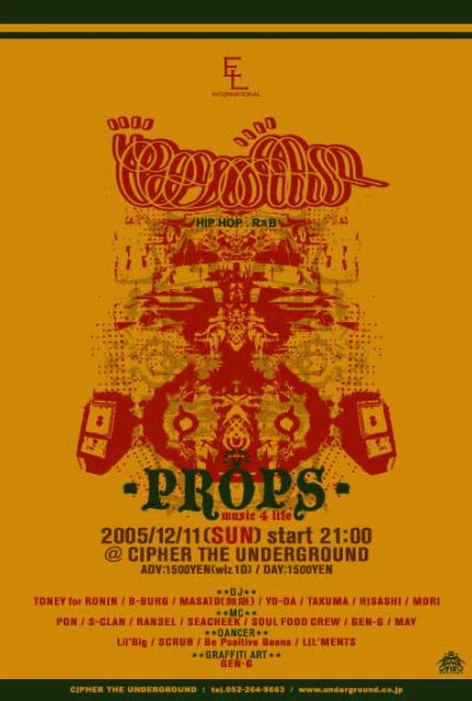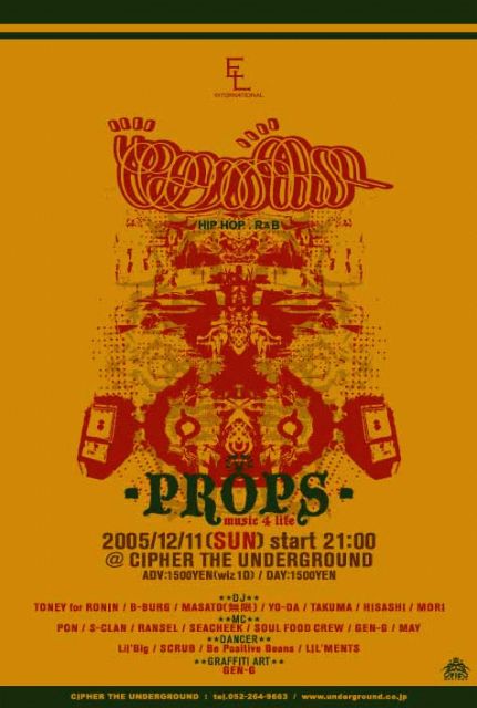 日時:2005/12/11(SUN) start 21:00 料金:ADV.1500yen(1D) DAY.1500yen 場所:CIPHER THE UNDERGROUND DJ's:TONEY for RONIN/B-BURG/MASATO(無限)/YO-DA/TAKUMA/HISASHI MC'S:PON/S-CLAN/RANSEL/SOUL FOOD CREW/GEN-G/MAY DANCER'S:Lil'Big/SCRUB/Be Positive Beans/LIL'MENTS GRAFFITI ART:GEN-G