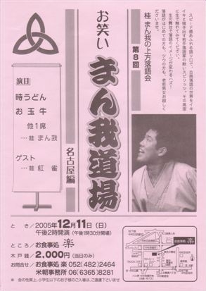 出演:桂まん我・桂紅雀(ゲスト) 13時30分開場 14時開演 入場料:2000円(当日のみ) 問合せ 052-482-2464(楽) 06-6365-8281(米朝事務所)