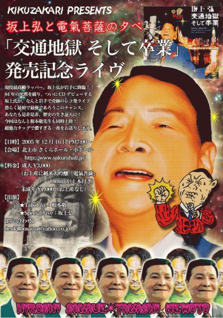 坂上弘氏(http://www.bls-act.co.jp/artist/sakaue_hiroshi.php)が岩手に降臨!!! 84年の沈黙を破り、ついにCDデビューを果たした坂上氏が、なんと岩手でレコ発ライブ! 恐らく最初で最後であろうこの機会。あなたも歴史の証人に! 今回はなんと特殊漫画家・根本敬先生も同時上陸! 超強力タッグで濃すぎる一夜をお送りします!!! 【日時】2005.12.16 PM7:00〜 【会場】北上市 さくらホール・小ホール http://www.sakurahall.jp/ 【料金】成人\3,000 (お土産に純米大吟醸『電氣菩薩』180mlが1本付き)