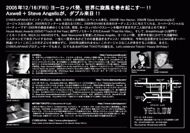 DJS: AXWELL (Axton). STEVE ANGELLO (Size/Subliminal). MITOMI TOKOTO (CYBERJAPAN).