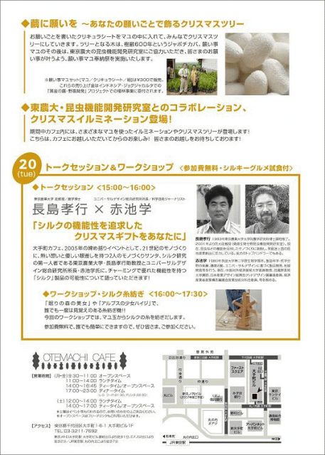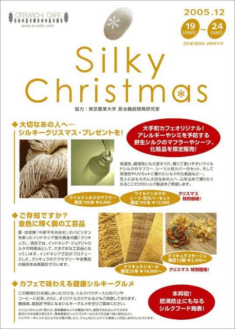 大手町カフェでのイベント情報を入手しました 「シルキークリスマス」と題して、最近その優れた機能性が注目されている、シルクの機能性を体感していただく展示販売及びトークショウを開催します。 シルクは生体親和性が高いほか、UV(紫外線)をカットしたり、脂肪吸着力を持つなど、すぐれた機能があります。このような機能を活かした、ワイルドシルクマフラーやシルク化粧品他、シルク製品を販売いたします。 また「愛・地球博」で使用したインドネシアの黄金繭の展示もございます。期間中シルク製品をお買い上げ頂いた一部は、インドネシアの