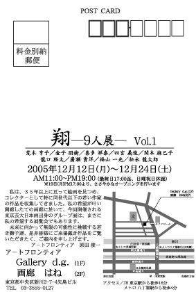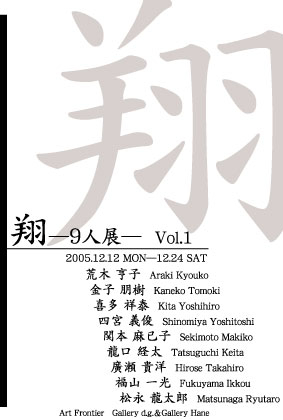 ◇ ◇ ◇ ◇ ◇ ◇ ◇ ◇ ◇ ◇ ◇ ◇ ◇ ◇ ◇ ◇ ------------------------------------------------- 『翔―9人展― vol.1』(企画展) 荒木 亨子/金子 朋樹/喜多 祥泰/ 四宮 義俊/関本 麻己子 龍口 経太/廣瀬 貴洋/福山 一光/松永 龍太郎 ------------------------------------------------- 会期/2005年12月12日(月)〜12月24日(土) 開館時間/午前11時〜午後19時(最終日17時、日曜祝日休廊) ※19日(月)17時より、ささやかなオープニング。
