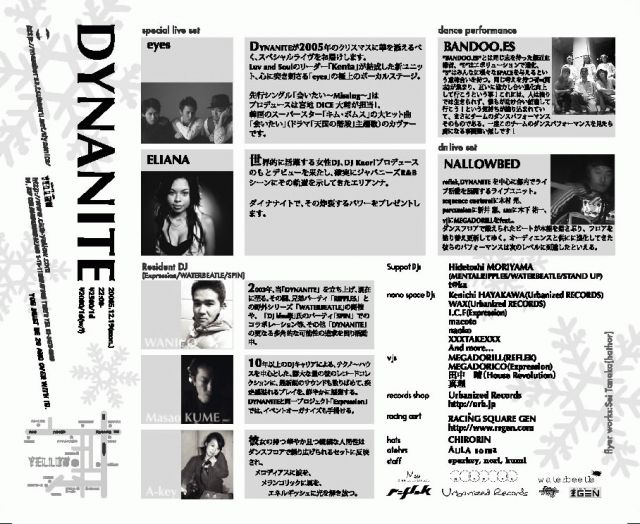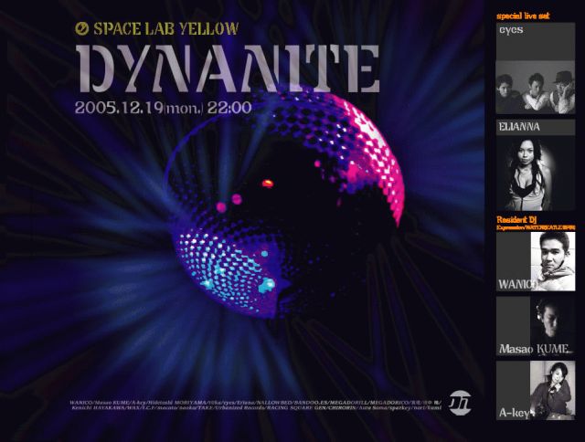 気づいたらもう一週間前・・・ みんないっしょにDYNANITE楽しもうねー!!! 今回は、クリスマスパーティーですよ☆ メジャーアーティスト 『eyes』『ELIANA』を迎えての スペシャルLIVE!!! 終電まででもLIVE楽しめますよー!! ぜひぜひ遊びに来てくださいね☆ DATE* 1219(mon) 2200〜 at* SPACE LAB YELLOW http://www.club-yellow.com/ DANCE FLOOR* ★SPECIAL LIVE SET eyes http://www.eyes-tv.com/ Eliana ★Resident DJ WANICO Masao KUME A-key ★Support DJ Hidet