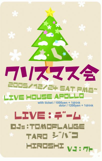 街中がクリスマス色に染まり、あとはその日を待つばかりですね な〜んと、クリスマスイヴにイヴェントを開催します! アフリカンのジェンベチーム「デーム」の熱いライブとぶっ飛ぶDJそして、ナイスでクールなVJとのスペシャルセッション! Sound、Dance、Visual&Moreで何が起こるかはお楽しみ そうそう、クリスマスプレゼントもご用意しています数に限りがありますのでお早めにね! みんなで楽しく愉快にクリスマスを楽しみましょう♪ クリスマス会 Date 12.24 Start 8:00〜 Place スタジオ アポロ(出雲ドーム横) Fee A