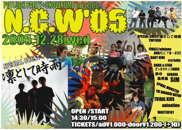 POTLUCK PARTY+SHOWNUMB prezents... N.C.W'05 12/28(WED) OPEN /START 14:30/15:00 TICKETS/a\1000-d\1200-(+1D) SPECIAL GUEST/凛として時雨 TOP/Killi | FINALE/adajann AND/(以下A〜Z順) BABY NINE cry baby DARK★STAR どっさりキノコ海賊団 楽心 GERARA SiM SPiRAL MONSTER THE HARAKIRI NATION TRIBAL KIDS unionline WASTED161