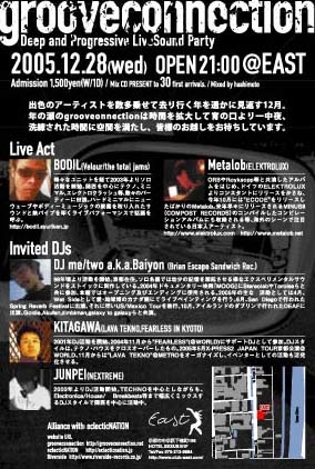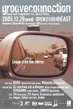 【grooveconnection -Leave it on the mirror- 】 12/28[wed] @EAST (KYOTO) open 21:00 Door 1,500yen(W/1D) ■Live Act BODIL (Velour/the total jams) Metalob (ELEKTROLUX) ■Guest DJs DJ me/two a.k.a.Baiyon (Brian Escape Sandwich Rec.), KITAGAWA (LAVA TEKNO), JUNPEI (NEXTREME) ■DJs ITO (Riverside), ITO Akane, Hiramatsu, hashimoto ■VJs: doppo, douke ※先着30名様にhashimotoのMixCDをプレゼント! 出色のアーティストを数多乗せて去り行く年を遥かに見返す12月。 年の瀬のgroove