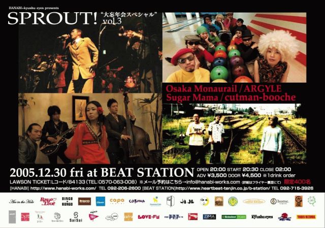 Sugar Mamaまさかの年内福岡再上陸です! しかも他の出演者もかなり素晴らしいです。メンツ見てどうせ大阪のイベントやろって思った方も多いはず。いやいや福岡でやりますよ!九州・山口・広島の皆様、今年最後の熱〜い宴に是非是非お越し下さい! ━━━━━━━━━━━━━━━━━━━━━━━ □ SPROUT!vol.3 "大忘年会スペシャル" 2005.12.30(Fri) at BEAT STATION ━━━━━━━━━━━━━━━━━━━━━━━ 今年もやります!呑めや踊れやの大忘年会スペシャルライブ! 気になる出演アーティストは。。。 KENNY DOPEに