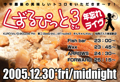 12/30(金) くずるぴっと3年忘れライヴ 〜今年最後の美味しいトコロをいただきま〜す!〜 ◎Fish bar 23:00〜 ◎Wxx 23:45〜 ◎ARROWS 24:30〜 ◎FORWARD 25:15〜 俺と普工の二人で住吉4店舗歌い回ります。 きんちゃんもアコーディオンorピアニカで乱入予定。 嵐の様に演って次に行くので、早めに来て呑んでてくださいな。 博多時間+ヲカマ時間で来てもライヴはもう終わってます。(笑) ちなみに全てゲイバーなのでノンケさん女性の方はごめんなさい。m(__)m