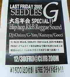 イベント告知失礼します。 今年のラストフライデー!! 『SEEDLESS G PRESENTS大忘年会SPECIAL!!』 HIP HOP,R&B,REGGAE SOUND 12.30(Fri)@ZOOM 21:00〜LAST ¥1500(2d付!!+フライドポテト食べ放題!!+他フード付!!) 今年もあと少しです☆今年最後に飲んで食べて騒いで踊れるイベントのお知らせです☆今回はDJs All Night♪また激お得な値段です☆年齢問わず楽しめます♪30日はぜひZOOMに遊びにきてください!! DJ陣も今年最後なんで気合い入れて盛り上げます☆ちなみに来年もSEEDLESS Gをよろしくです