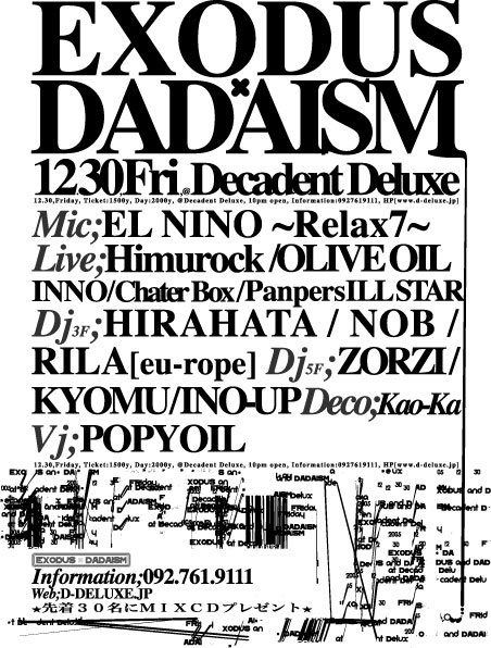 2005.12.30(FRI) EXODUS×DADAISM AT DecadentDeluxe (3.4.5F) HOUSE/HIPHOP/ELECTRO/CROSSOVER Mic; EL NINO 〜Relax7〜 Live; Himurock OLIVE OIL INNO ChaterBox PanpersILLSTAR Dj3F; HIRAHATA NOB RILA[eu-rope] dj5F; ZORZI KYOMU INO-UP DECO; Kao-Ka vj; POPY OIL ★先着30名にオリジナルCDプレゼント★ Ticket: 1500YEN/2000YEN 10pm open infomation 092-761-9111 web http://www.d-deluxe.jp
