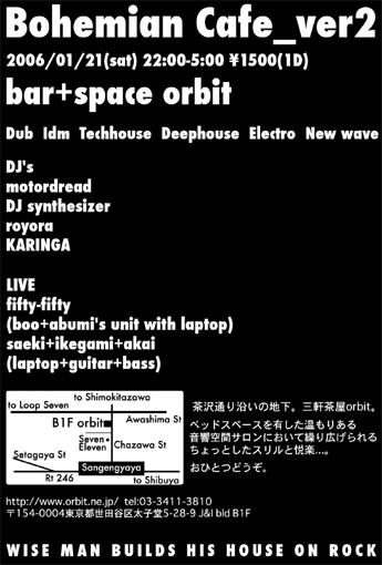 今回は初の試みとして神戸のTroop cafeと初のジョイン!!西と東のBreaksの今後をになう新しいパーティとしてスタートする。東京サイドのサポートDJにはHyperのBedrock BreaksのCDに楽曲の提供もしているKemek The Dope Computer、RRよりTO