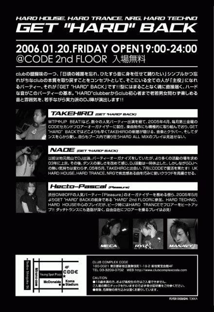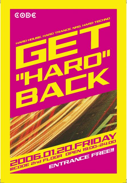 clubの醍醐味の一つ、「日頃の雑踏を忘れ、ひたすら音に身を任せて踊りたい」シンプルかつ忘れがちなclubの本質を取り戻すことをコンセプトとして、そこにいる全ての人が「主役」になれるパーティー、それが[GET “HARD” BACK]です!!型にはまることなく魂に直接届く、ハードな音がこのパーティーの基本。”HARD”clubberからclub初心者まで老若男女問わず楽しめる音と雰囲気を、若手ながら実力派のDJ陣が演出します!