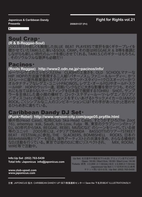 Japonicus & Caribbean Dandy Presents 2006/01/27 (Fri) FIGHT FOR RIGHTS Vol.21 @ UP SET Soul Crap (ex Blue Beat Players) + Pacinos (from Hiratsuka) + Local guest bands!! Caribbean Dandy DJ Set : Satol Fujii (Head Case) + Kazhiro Sudo (The Zoot 16) & More DJs from Tokyo!! / Images: VJ HAMA’S (Caribbean Dandy) Up Set: 名古屋市千種区池下1-4-23. アミュゾン池下ビル5F Open: 18:00 / Start DJs: 18:00 / Start Live: 18:30 Tickets: 前売 ¥2,000 (+ 1 Drink) /当日 ¥2,500 (+ 1 Drink) Japonicus/ Up Set