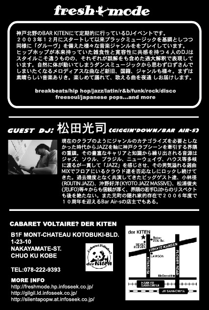 ゲストには、オールジャンルミックスの新境地を開拓したクボタタケシ氏、昨年、自身のバンド"YOUR SONG IS GOOD"としてFUJIROCK他大型フェスでも引っ張りだこだったサイトウジュン氏、SECOND ROYALからは、昨年CDリリースも記憶に新しい高橋孝博こと"HALFBY"、森野義貴こと"HANDSOMEBOY TECHNIQUE"が登場!
