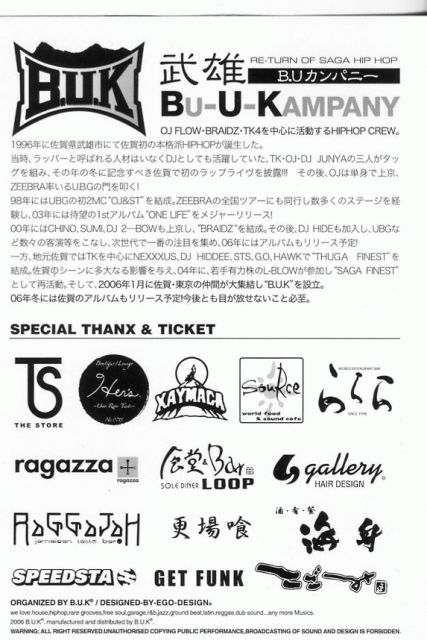 『B.U.K』主催のイベント 新年第1発目のBIG PARTY☆ 2006年1月3日!ここにまた新たなCREWが誕生する! その名も『B.U.K』 佐賀出身のMC・DJ・TRACK MAKER等のアーティストを 中心に結成!した本格派の集団 その結成を祝して、記念すべきイベントを開催☆ また、佐賀県内外の第一線で活躍しているアーティスト達が 挙って参加! 前例がないほどの豪華メンツで新年を盛り上げます! 是非、歴史に残るこのPARTYに、みんなでおこしください!!! (もっと詳しく知りたい