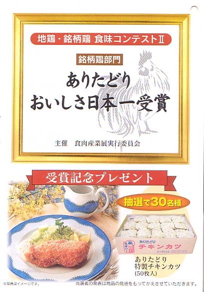 皆大好き「ありたどり」が日本一を受賞したことを記念して、こんなプレゼントやってましたよ!! こりゃ〜「どんどん」ファンとしては参加しないわけにはいかないでしょう〜!!私はもちろんその場で応募してきました! 抽選で30名様 『ありたどり特製チキンカツ(50枚入り)プレゼント』 *当選者は発送を持ってかえさせていただきますそうな 応募用紙は「どんどん」にありましたが、他のスーパーにもあるのかもしれません。締め切り近し!応募急げ!!