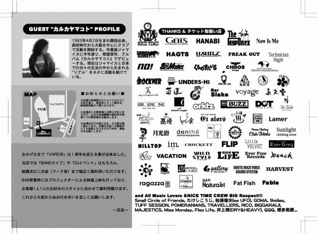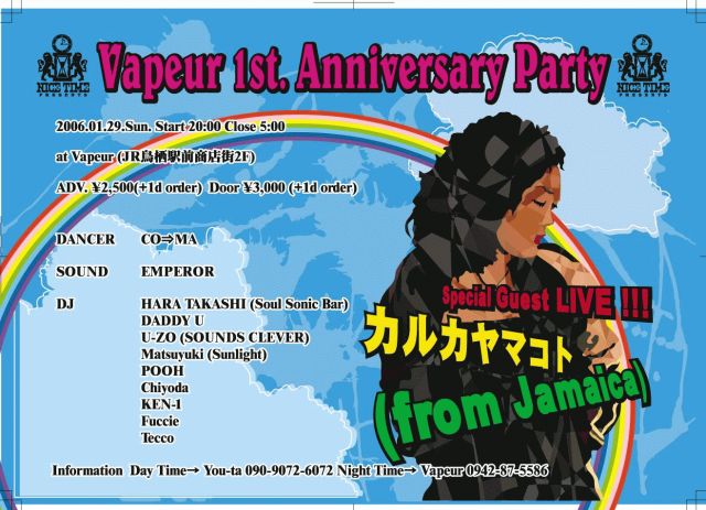 あのカルカヤマコトが九州のイベントに登場します。 2月にはジャマイカに帰国するとのことなので 生で彼女を体感できるのはラストチャンスとなる かも知れません。 ★★★【VAPEUR 1st ANNIVERSARY PARTY】★★★ 2006.01.29(日) 20:00〜 at:VAPEUR(鳥栖)tel:0942-87-5586 ADV\2.500-(要1Dオーダー) SPECIALGUEST LIVE!!カルカヤ マコト(from jamaica) DANCER!!CO⇒MA SOUND!!!EMPEROR DJ's!!!!HARA TAKASHI(soul sonic ber) DADDY-U U-ZO(SOUNDS CLEVER) Matsuyuki(usual) POOH Chiy