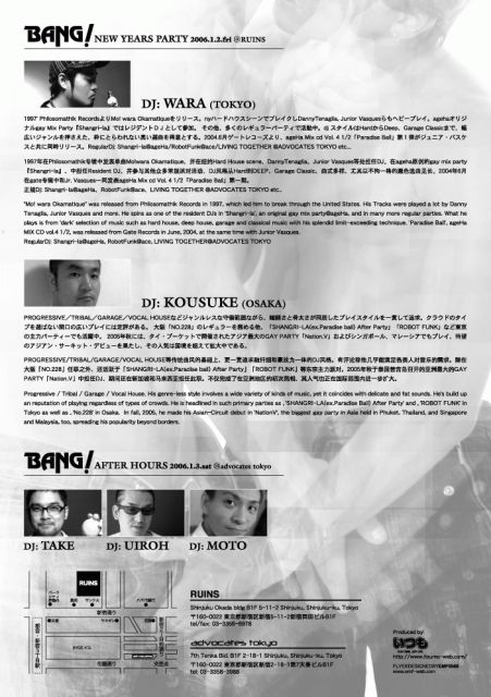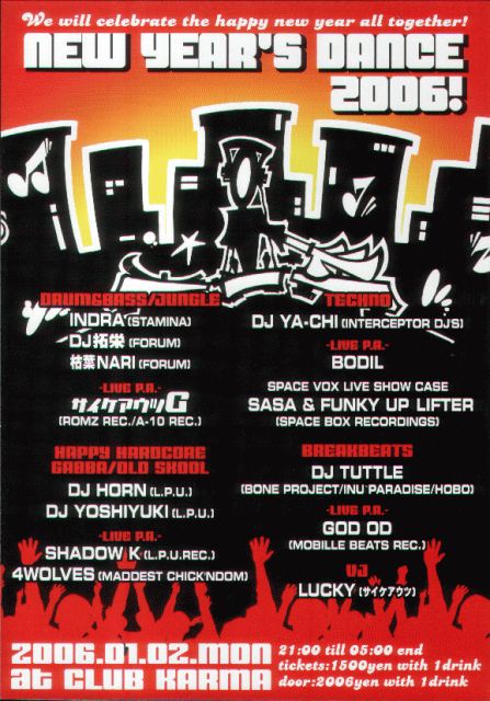 2006年最初のビッグサプライズはIDJUT BOYSの来日、そして群馬でのこの蒼々たる日本人DJ陣との競演ではないのだろうか!!と急に声を荒げてしまって申し訳ないが、それぐらいイベントのシチュエーション/メンツともにビッ