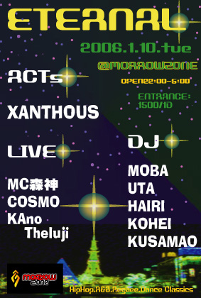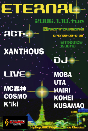 管理人様 告知失礼致します。 もし不適切な場合はお手数ですが削除願います。 2004年度54期卒の方々は2006年で成人。 という事で、2006.1.10 成人式の翌日に馴染みの顔、久々に会う顔、 ひっくるめて皆で成人を祝いましょう。 ACTは北高卒業者も所属する若手HipHopユニット「XANTHOUS」。 XANTHOUSのアルバム完成後、初のお披露目イベントとなるので盛り上がる事は必至。 楽しめるイベントになることをお約束して皆さんに告知させていただきます。 是非遊びに来て下さい。 2006.1.10 tue 「ETERNAL」 open 22:00 entrance