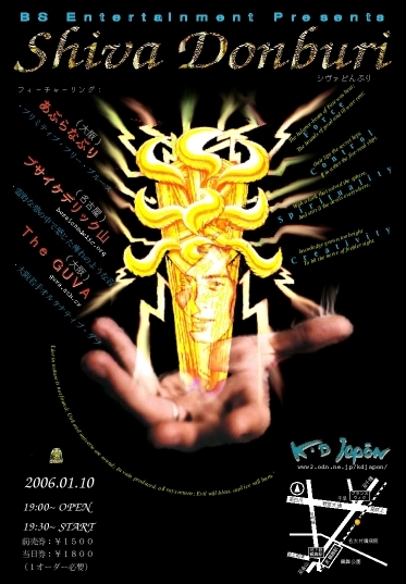 BSエンターテイメント・プレゼンツ シヴァーどんぶり 2006/01/10 @KD Japon(ハポン) 19:00~ OPEN 19:30~ START ブサイケデリック 山 あぶらなぶり The GUVA ・霊的な夢の中で感じた痺れのような音 ・プリミティブ・フリー・ブルース ・大プッシュ大阪若手 オルタナティブ・ダブ http://mixi.jp/view_community.pl?id=222010 http://busaichedelic.org http://guva.ath.cx 公演のチケットは052-251-0324 〒460-0012 名古屋市中区千代田5丁目12-7 TEL (052)251-0324 ・JR鶴舞駅北口より高架沿いに北上(千