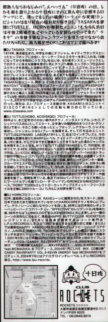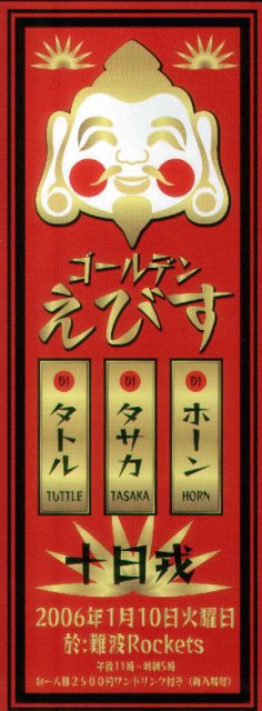 関西人ならおなじみの”えべっさん(今宮戎)の日、しかも最も盛り上がる十日戎にそのど真ん中に位置するロケッツにて、待ってましたの痛快パーティーが実現!ドンピッシャ!のはまり具合の超お祭り好きDJ、TASAKAを筆頭にTUTTLE、HORNが爆裂セッション!もちろん当日は午前2時すぎまでやってる全国からやって来た”テキヤ”の多種多様なジャンクフードをほおばりながら出たり入ったり、再入場全然OK!これはマジで遊べるぞ! ゴールデンえびす 2006年1月10日火曜日 難波ROCKETS 午後11時〜明朝5時 お一人様 2500円ワンドリンク付(再