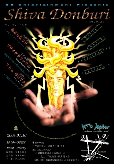 BSエンターテイメント・プレゼンツ シヴァーどんぶり 2006/01/10 @KD Japon(ハポン) 19:00~ OPEN 19:30~ START ブサイケデリック 山 あぶらなぶり The GUVA ・霊的な夢の中で感じた痺れのような音 ・プリミティブ・フリー・ブルース ・大プッシュ大阪若手 オルタナティブ・ダブ http://busaichedelic.org http://guva.ath.cx 〒460-0012 名古屋市中区千代田5丁目12-7 TEL (052)251-0324 ・JR鶴舞駅北口より高架沿いに北上(千種方面)徒歩約3分 ・同じく地下鉄鶴舞駅2番出口より徒歩約7分 http://ww