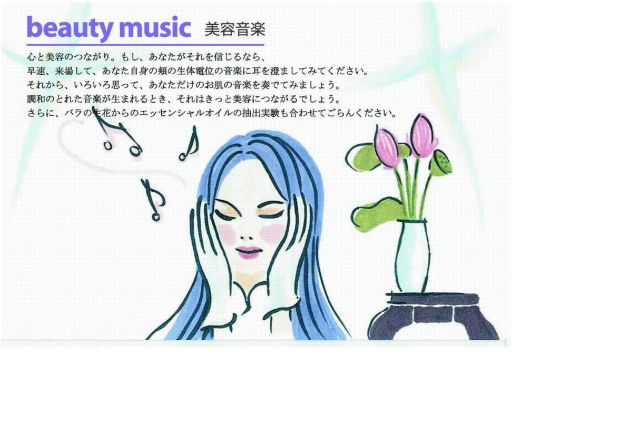 beauty music 美容音楽 作 銅金裕司 http://www2.kb2-unet.ocn.ne.jp/ask/default.htm ASK? art space kimura 東京都中央区京橋3-6-5 木邑ビル2F 2006年1月10日(火)〜1月21日(土) open 11:30 am - 7:00 pm (最終日5:00 pmまで) ・・・ 心と美容のつながり。 もし、あなたがそれを信じるなら、早速来場して、 あなた自身の頬の生体電位の音楽に耳を澄ましてみて ください。それから、いろいろ思って、あなただけのお肌の音楽を奏でてみましょう。調和のとれた音楽が生まれるとき、それはきっと美容につながるでしょう。