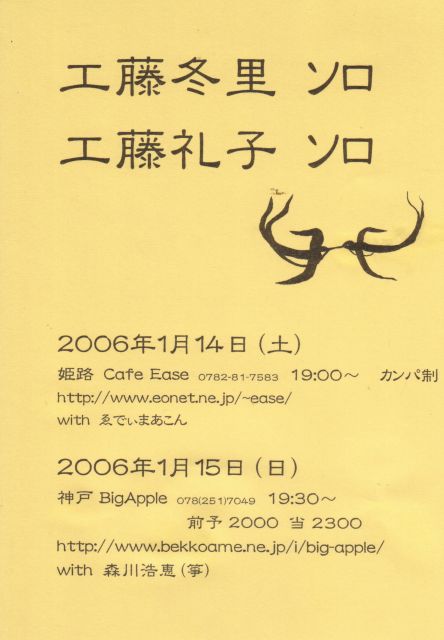 2006年1月14日(土) 姫路 Cafe Ease 0782-81-7583 19:00〜  カンパ制 http://www.eonet.ne.jp/~ease/ with ゑでぃまあこん 2006年1月15日(日) 神戸BigApple 078(251)7049 19:30〜 前予2000 当2300 http://www.bekkoame.ne.jp/i/big-apple/ with 森川浩恵(箏)