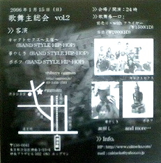 (株)))客盗商会 presents 「歌舞主総会 vol.2」〜新音ん会〜] ●1/15日(日)  @渋谷EGGMAN ●開場24:00/開演24:00/終演5:00 ●客演   ≫キャクトセクス ~主催~ ( BAND STYLE HIP-HOP )  4MC,Gt,Key,Ba,Dr,DJ,Per  ≫華やしき ( BAND STYLE HIP-HOP )  4MC,Key,Ba,Dr,Per  ≫ポポフ ( BAND STYLE HIP-HOP )  Singer,MC,Gt,Gt,Key,Ba,Dr http://mixi.jp/view_community.pl?id=522543 ●皿回し  ≫小峯 尚(CROSS OVER)  ≫IONA(HOUSE)  ≫xxx(HOUSE)  And more... ●歌舞券一口(チケット料金