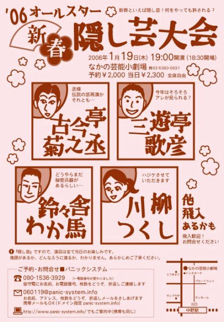 ¿·½Õ¤È¤¤¤¨¤Ð±£¤··Ý¡ªº£Ç¯¤Ç£²²óÌܤˤʤê¤Þ¤¹¡£ ¡ØËܷݤǤʤ¤¥Í¥¿¡ÙÈäϪ¤È¡¢¤ª³Ú¤·¤ß´ë²è¤Î²ñ¤Ç¤¹¡£ Æü»þ¡§2006ǯ1·î19Æü(ÌÚ) 19:00³«±é (18:30³«¾ì) ²ñ¾ì¡§¤Ê¤«¤Î·Ýǽ¾®·à¾ì (£Ê£Ò¡¦Ãϲ¼Å´ÃæÌî±ØË̸ýÅÌÊ⣵ʬ) ½Ð±é¡§¸Åº£ÄâµÆÇ·¾ç¡¿»°Í·Äâ²Îɧ¡¿Î롹¼Ë¤ï¤«ÇÏ¡¿ÀîÌø¤Ä¤¯¤· ÎÁ¶â¡§Í½Ìó¡ï2,000¡¿ÅöÆü¡ï2,300 ¢¨±£¤··Ý¤È¤¤¤¦¤³¤È¤Ç¡¢ÆâÍÆ¡¢¤ª¤è¤ÓÍî¸ì¤¬¤¢¤ë¤«¤É¤¦¤«¤Ï ÅöÆü¤Î¤ª³Ú¤·¤ß¤È¤¤¤¦¤³¤È¤Ë¤·¤Æ¤ª¤ê¤Þ¤¹¡£¤É¤¦¤¾¤´Î»¾µ¤¯¤À¤µ¤¤¡£ ¤´Í½Ì󡦤ªÌä¹ç¤»¤Ï¤³¤Á¤é¤Þ¤Ç¤É¤¦¤¾¡§ http://www.panic-system.info/