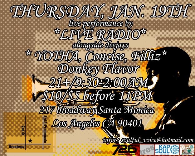 Â裶²óVOICE ¤«¤Ê¤êÉÔ±¢µ¤¤Î¤ªÞ¯Íî¤ÊLounge¤Ç¤¹¡£ ÌÀ¤«¤ê¤¬¥í¥¦¥½¥¯¤À¤±¤Ç¤¹¡£ ²»¤Î¤Û¤¦¤â¤½¤ÎÉÔ±¢µ¤¤Ë¤Ô¤Ã¤¿¤ê¤ÎDJ¤¬¤½¤í¤Ã¤Æ¤¤¤Þ¤¹¤Î¤Ç¡£ ³§¤µ¤óÀ§ÈóÀ§È󡦡¦ ¡úVoice At Lounge 217¡ú £±¡¦£±£¹th Thursday HIP-HOP FANK&SOUL Music Live Performance ¡úLive Radio¡ú ¡ùKeentoker¡ù DJ's Yotah Concise Filiz Donkey Fl Lounge 217 217 Broadway Santa Monica CA 90401 21+/9:30¡Á2:00 $10/$5 Before 11:00
