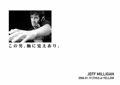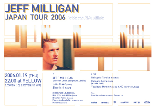 2006.01.19 [THU] 22:00 at YELLOW 3,000YEN [1D] 2,500YEN [1D W/F] DJ JEFF MILLIGAN [Revolver, Onitor, Background, Canada], RealJoker [fat32], Shunichi [fonart] LIVE Nobuyuki Tanaka [Fourtails], Mitsuaki Komamura [arktekt, fat32] Yasuharu Motomiya aka Y.MO [NordForm, fat32] CHAOSPACE LOUNGE DJs HYK, NZA, Nobuki Nishiyama, Ryuichiro Konno [Zhomba], Fujyou aka Lonely Boy [sidewalk records], M.Ohoka [tent,neiro] VJs Dtox Decks Crew [NordForm], banana co. Event Produced and Tour Managemen