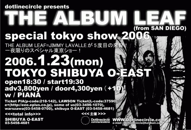 dotlinecircle presents THE ALBUM LEAF special TOKYO SHOW! THE ALBUM LEAF=JIMMY LAVALLEの5度目の来日が決定!SUBPOP/CITY SLANGと契約し、ジミーの長年の仲間であるSIGUR ROSのスタジオで録音、そしてゲストにSIGUR ROS,BLACK HEART PROCESSIONなどのメンバーが参加したことなど話題になり世界的にさらなる注目をあびてTHE ALBUM LEAFの出世作となった3rdアルバム"IN A SAFE PLACE"をひっさげての来日!リリース後の日本でのショーはこれがはじめてになります!東京一日のみのスペシャルショー!