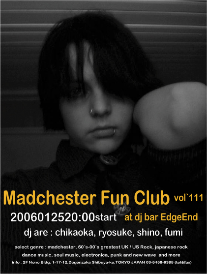 ☆MANIX☆です。 告知遅れました。。ダメ男です… また改めて明けましておめでとうございます! 本年も宜しくお願いします! という事のMCFCも111回目! 111(ワンワンワン)です。 ******************************************* ■MCFC -MadChester.F.C- vol.111 □日時 2006年1月25日(水)20:00〜23:00 □場所 『EdgeEnd(エッヂエンド)』 東京都渋谷区道玄坂1-17-12 野々ビル2F http://www.edgeend.com TEL:03-5458-6385 \800 (charge and 1drink and selected CD!) □ジャンル UK/US
