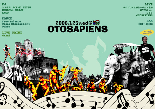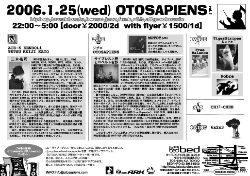 告知失礼します! 『OTOSAPIENS』 1/25(wed)@池袋bed 22:00-5:00 door\2000/2d with flyer\1500/1d hiphop,breakbeats,house,jazz,funk,r&b... --DJ-- 三木祐司 ACE-K TETSU KENBOLI REIJI KATO --LIVE-- サイプレス上野とロベルト吉野 MOTOY(JR) ジグロ OTOSAPIENS --DANCE-- Free Balance Tiger Stripes&のどか Poble --SAX-- CHI3-CHEE(THINK TANK) --LIVE PAINT-- 6x2x3 dj、ラップ、ダンス、ビートボックス、サンプラーなどを使って 遊び倒す劇空間集団「OTO-SAPIENS」が贈るパ〜ティ〜