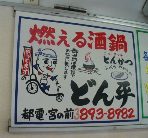 第3回オフ会を開催いたします。 1月ということで新年会を兼ね、 飲み会主体で行いたいと思います。 しかし、東京Deep。 普通の酒場で新年会は行いません。 謎の(笑)店、都電宮の前にある 『どん平』で行います。 皆で「燃える酒鍋」、「ニュータッチとんかつ」、更にイラストの謎にいどみましょう♪ 『どん平』 荒川区西尾久2−2−5 午後7時より (午後6時50分、都電「宮の前」駅) 会費は5千円程度だと思います。 ・宴会コース3500円  (酒鍋・とんかつ・刺身他)+飲み物 お店のキャパがありますので