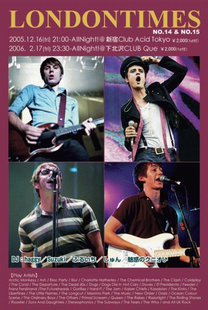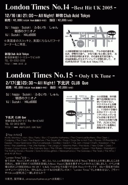 今年もよろしくお願い致します。 2006年最初の開催のお知らせです。 お気軽に遊びにいらして下さいね。 “London Times No.15” ジャンル:UK Rock 日時:2/17(金)23:00〜All Night! 場所:下北沢Club Que 03-3412-9979 住所:世田谷区北沢2-5-2 Big-BenビルB2 http://www.ukproject.com/que/ ※下北沢駅南口から徒歩3分。 マクドナルドと京樽の間の道を直進。 一つ目の十字路の左手にファーストキッチンのあるビルのB2が、 『Club Que』です。 前売:\2000(1d&UK Rock選曲CD-R付) 当日:\2000(1d付) ※前売、質問等こちらで