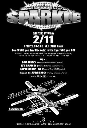"SPARKLE"(毎月第2土曜日23:00〜開催!) @REALIZE Ginza 毎月弟2土曜日23:00〜華の銀座でお送りしているNEWイベントです!ダンクラ、Funk、Soulから最新R&B・Hip-Hopまで、Black Music全般を楽しんで頂けるイベントです! 今回11回目はレギュラーのETSUKO、BROTHER-Mの2人+ゲストDJにDJ UMENO(赤坂GQ)を迎えてお届けし致します!レギュラーのKIYOMI2月のみお休みさせて頂いて、DJ NOAKOが登場します!☆2月も皆さまと一緒に楽しい夜を過したいと思っております!SPARKLE・・・煌き、閃光・・・あなた