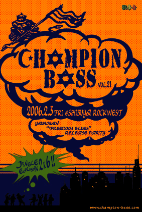 【CHAMPION BASS VOL.21 -YAHMAN “FREEDOM BLUES” RELEASE PARTY-】 2006.2.3(FRI)@SHIBUYA ROCKWEST OPEN/START 22:00 CHARGE : door/\2000(1d),with flyer/\1500(1d) 《CHAMPION BASS CREW》 YAHMAN DON JAHTOME 《CANDLE ART》 EQUINOXXX 4年目に入ったJUNGLE PARTY【CHAMPION BASS】2K6一発目! 今回は、YAHMANのミックスCDリリース記念の宴! 当日、会場にて先行販売を行なう。 DJはCHAMPION BASS CREWのみ。 CHAMPION BASS、そしてJUNGLEの真髄をとことん味わえる夜! 「JUNGLEでなければここまで表現す