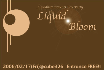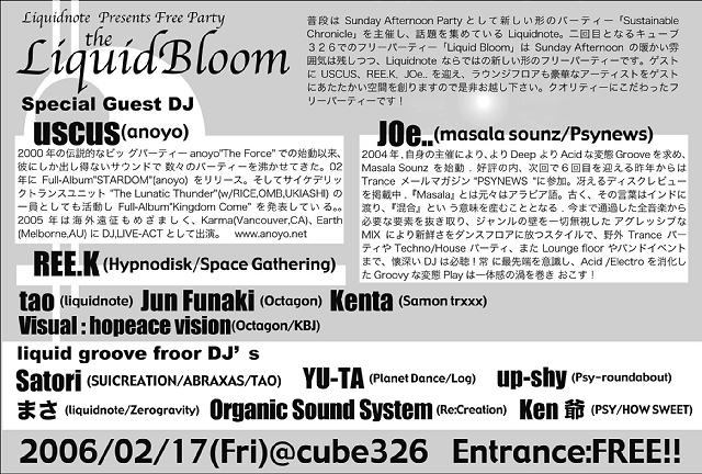 ◎Liquidnote Presents Free Party!! 「Liquid Bloom」 2006/02/17(fri) @Cube326 Start 22:00 Guest DJs Uscus (Anoyo) JOe.. (Masala Sounz /PSYNEWS) FineDiner (Zenon /GrooveZone) DJs Jun Funaki (Octagon) tao (liquidnote) Kenta (samon trxxx) visual:hopeace vision (Octagon) - Liquid Groove Floor--- Guest DJ REE.K (Hypnpdisk /SpaceGathering) Satori (SUICREATION /ABRAXAS /TAO) DJs まさ (zerogravity /liquidnote) YU-TA (Planet Dance /LOG) Ken爺(Psy /HOW SWEET) up-shy