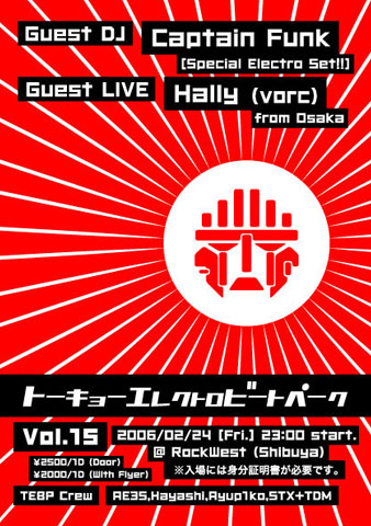 Tokyo Electro Beat Park Vol.15 2006/02/24 (Fri) @ RockWest (Shibuya) 23:00 Start 2500yen/1D (Door) 2000yen/1D (With Flyer) ※入場には身分証明書が必要です。 Guest DJ: Captain Funk (Special Electro Set!!) Guest Live: Hally (vorc from Osaka) TEBP Crew: AE35, Hayashi, Ayup1ko, STX+TDM --------------------------------------- お待たせ致しました。次回 Tokyo Electro Beat Park Vol.15 開催します! Funky Cargo!とのパーティーを除けばおよそ半年ぶりの開催となるTokyo Electro Beat Park。 ゲストDJ