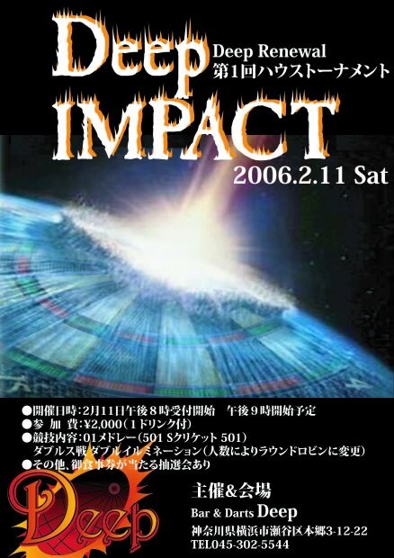 久々に広くなったDeepでハウストーナメントを開催します! 【タイトル】 Deep impact 〜2006 タン刺し祭〜 【日時】 2006年2月11日(土) 20時集合 21時スタート 【場所】 Deep 【試合形式】 501−クリケット−501 ダブルスのダブルイルミネーション (人数によりラウンドロビンに変更する可能性あり) 【Fee】 2000円(1drink付き) 【エントリー方法】 事前にお店に来てエントリーする お店に電話をする 知り合いに頼む 【その他】 試合以外にも抽選ですわの屋(焼肉屋)の お食事券6000円分などが当たり